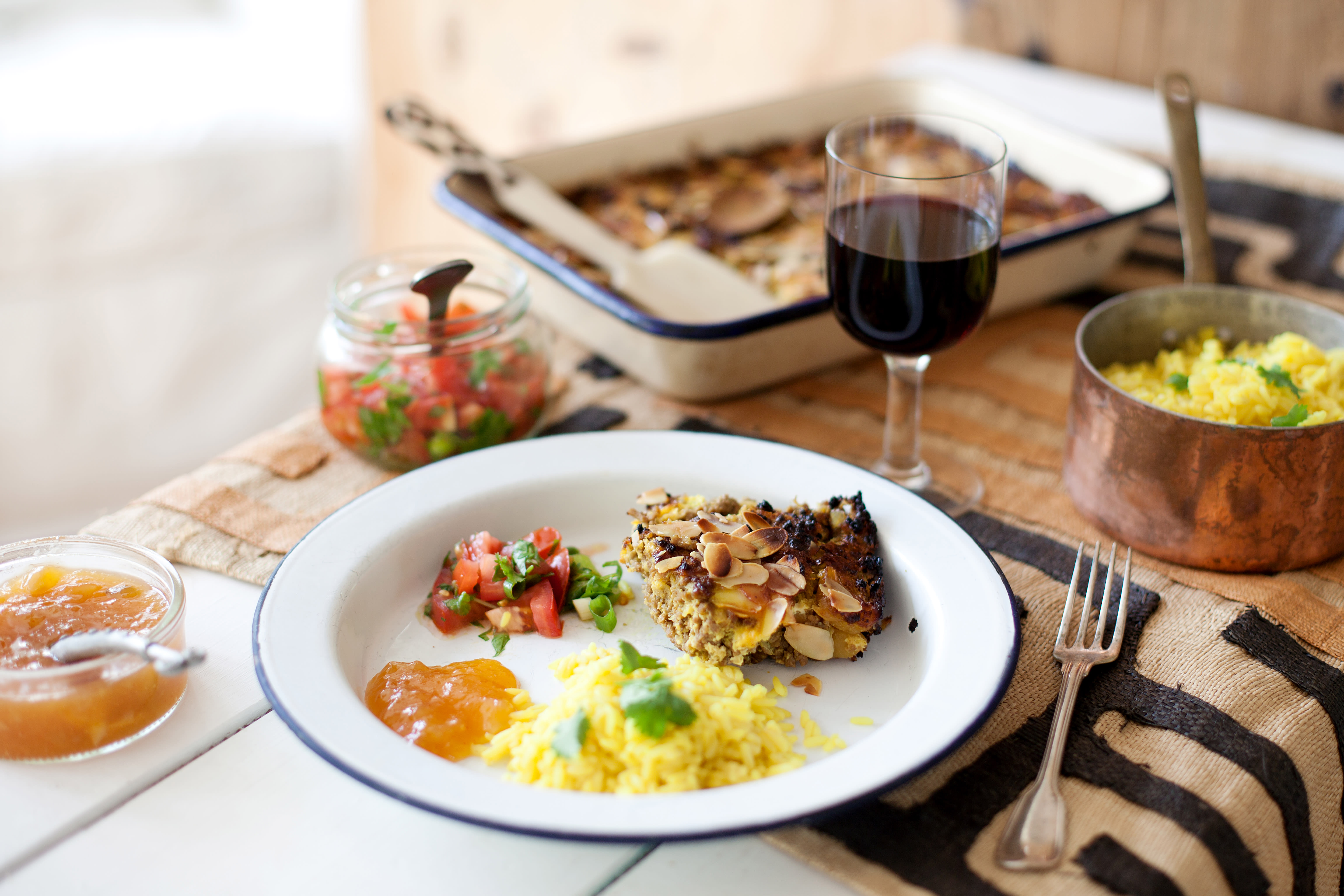 Pange kõik ained ahjuvormi, lisage loorberilehed ja mandlilaastud. Segage munad piima sisse ja kallake lihamassile. Küpsetage ahjus 35–40 min. Serveerige riisi, chutney ja tomatisambal'iga.