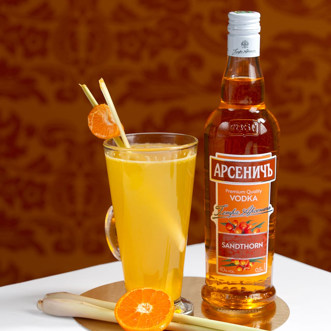 Vürtsikas ingveritee Arsenitch Sandthorn vodkaga, mis lisab joogile naturaalse astelpaju maitse.