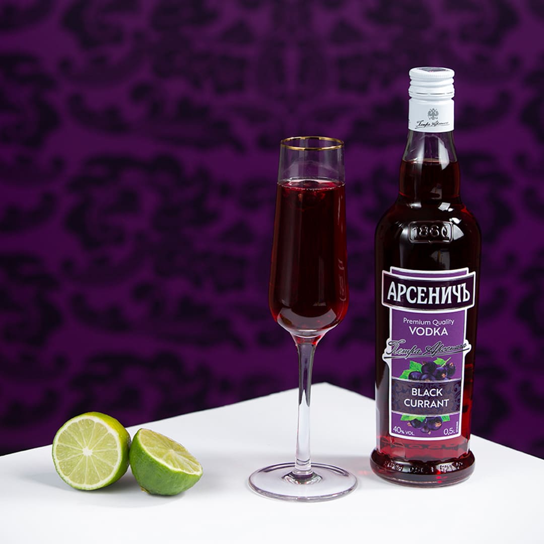 Täida kokteiliklaas jääga, lisa Arsenitc Black Currant Vodka ja mustasõstrasiirup ning sega õrnalt läbi.